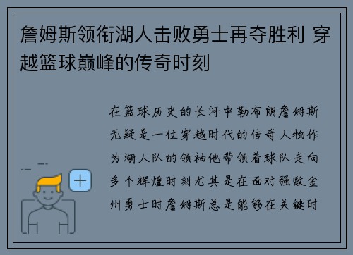 在篮球历史的长河中,勒布朗·詹姆斯无疑是...