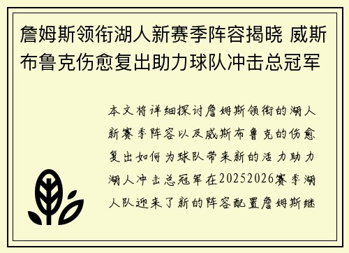 本文将详细探讨詹姆斯领衔的湖人新赛季阵容...
