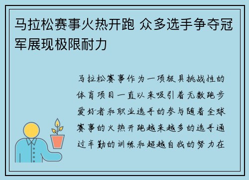 马拉松赛事作为一项极具挑战性的体育项目,...