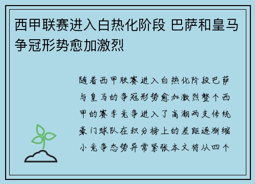 随着西甲联赛进入白热化阶段,巴萨与皇马的...