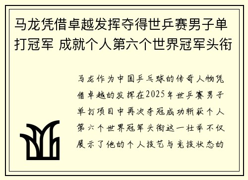 马龙,作为中国乒乓球的传奇人物,凭借卓越...