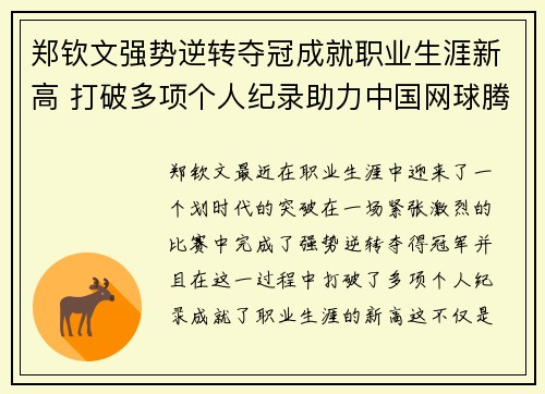 郑钦文最近在职业生涯中迎来了一个划时代的...