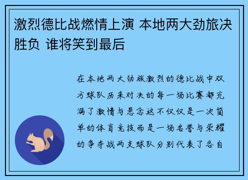 在本地两大劲旅激烈的德比战中,双方球队历...