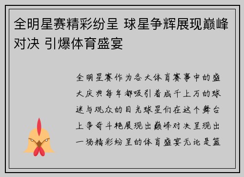 全明星赛作为各大体育赛事中的盛大庆典,每...