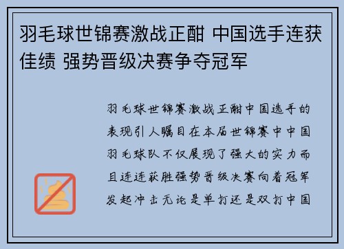 羽毛球世锦赛激战正酣,中国选手的表现引人...